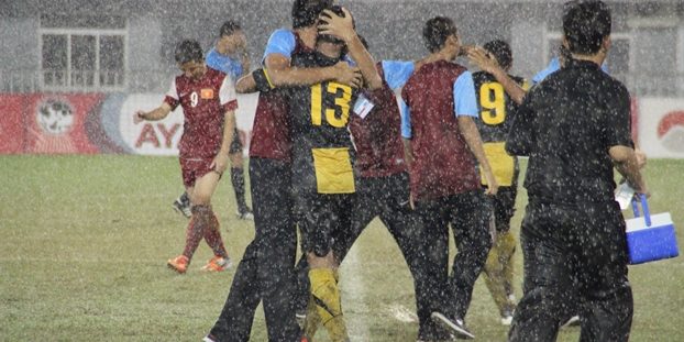There was nothing much either team could do in the first half or much of the second half as the rain continued to wreak havoc on combination play. A few mis-timed tackles and exchanges led Vietnam’s Vu Van Dung to be led out after a crash against Malaysia’s Muhammad Ghafar Abdul Rahman.