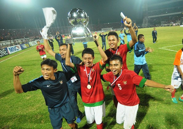 SURABAYA (22 Sept 2013) – Ilham Udin Armaiyn blasted the winner in the sudden death penalty shootout against Vietnam here tonight to hand Indonesia the prestigious AFF Under-19 Championship for the first time in the history of the tournament. After an intense 120-minute battle, Indonesia maintained their composure to defeat Vietnam 7-6 in thrilling shootout.