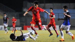 In the 16th minute, Kheang Menghour broke through the defence but was unable to make it past goalkeeper Zin Nyi Nyi Aung who threw himself at the ball. Soe Moe Kyaw’s powerful header rocked the crossbar in the 20th minute but that miss was soon forgotten when Win Naing Tun slipped past his markers, rounded the keeper and tapped Myanmar ahead in the 23rd minute.