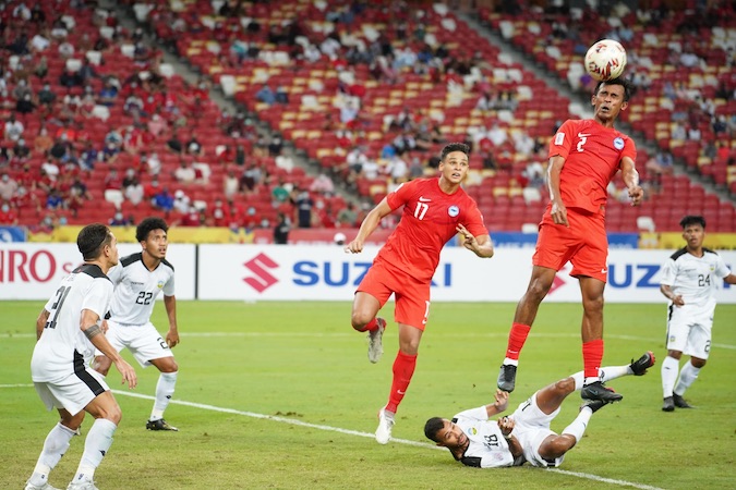 Singapore tried to take advantage of the aerial duels but the Timor defence almost always managed to make the clearance.