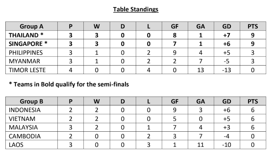 After three matches each, Thailand and Singapore lead Group A with the same nine points although the former currently occupy the top spot on better goal difference.