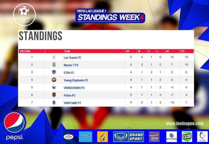 The win gave Lao Toyota 13 points from five matches – three points ahead of second-placed Master 7 FC, who this week thrashed Vientiane FT by the same 5-1 scoreline.