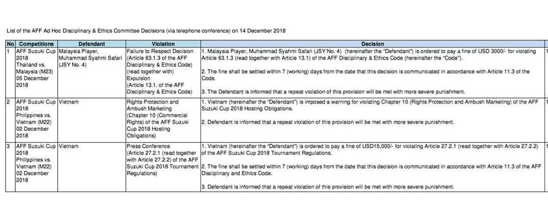HANOI (15 Dec 2018) – The ASEAN Football Federation (AFF) Ad Hoc Disciplinary and Ethics Committee made decisions on several cases at its meeting on December 14, 2018.