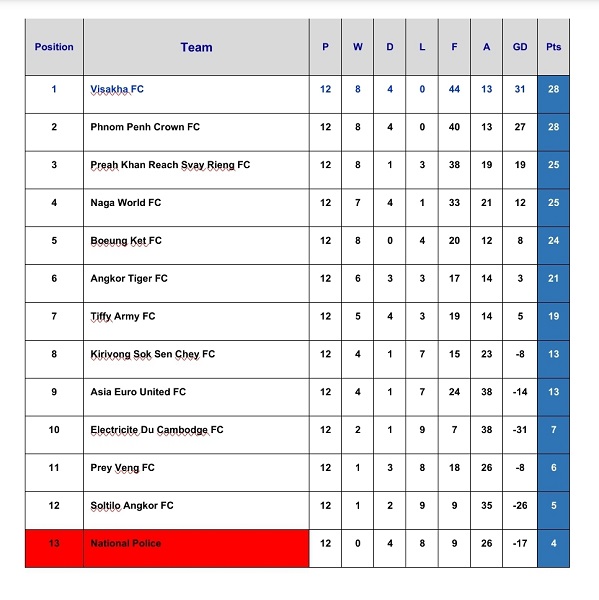 And following today’s draw against National Police, it has put Kirivong on the same 13 points with AEU from the same number of 12 matches played.