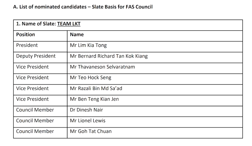 SINGAPORE (29 March 2021) – At the close of nominations today at 6pm for the election of the FAS Council (2021-2025), a total of one (1) application for the Slate contest (nine (9) positions) and eight (8) applications for the remaining six (6) Individual seats were received in good order.