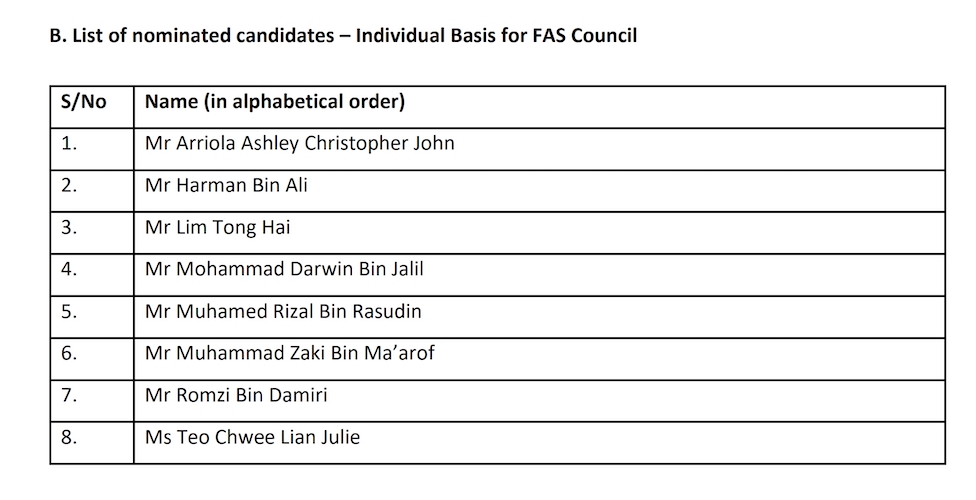 SINGAPORE (29 March 2021) – At the close of nominations today at 6pm for the election of the FAS Council (2021-2025), a total of one (1) application for the Slate contest (nine (9) positions) and eight (8) applications for the remaining six (6) Individual seats were received in good order.