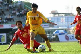Phnom Penh, who were pipped to the Cambodian Premier League crown recently by Naga Corp, were all satisfaction at the end of a largely entertaining encounter when they beat the latter 2-1 at the National Olympic Stadium. Two goals in the first half off Chan Rithy (in the 42nd minute) and Gbenga Samuel a minute later gave Phnom Empire the advantage although Chego Tkapi did pull a goal back deep in injury time for the final scoreline. In the other quarter-final match of the day, Build Bright University went past Lions Squad FC 2-0 to book their place in the semi-finals of the championship this year. Goals from N. S. Ahiem in the eighth minute and Prom Put Sithy in the 42nd minute were enough to give Build Bright the win. PIC: NAGA CORP FC (in yellow) up against PHNOM EMPIRE FC (in red) |