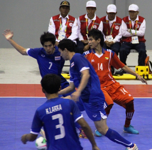 NAYPYITAW (17 Dec 2013) – It has often been said about Thai Futsal that even on a bad day, they can still beat anyone in ASEAN. And Vic Hermans men certainly proved this today when they thrashed hosts Myanmar 8-1 in the second semi-final of the men’s Futsal event at the Naypyitaw Futsal Stadium here.