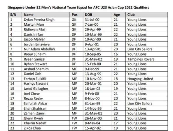 SINGAPORE (21 Oct 2021) – Singapore Under-22 Men’s National Team Head Coach Nazri Nasir today named the final squad for the upcoming Asian Football Confederation (AFC) U23 Asian Cup 2022 Qualifiers.