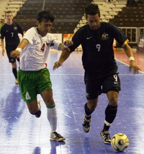 Although the first goal of the tournament was not forthcoming until the latter part of the first half, the drama which ensued immediately after Angga Suryasaputra had given Indonesia the lead in the 18th minute, saw Australia coming back to score twice within two minutes for a well-deserved 2-0 lead at the break. The Aussies, under the steady hands of coach Scott Gilligan, scored off Danny Henry in the 18th minute and Trent Russel a minute later. “I was a little concerned after the first fifteen minutes when it was scoreless but Indonesia dropped their guard after taking the lead and it was a good thing that we could score twice after that for the win,” said Gilligan afterwards. “We will have a break tomorrow which will be good for us as we prepare to play Malaysia in two days.” A minute after the restart saw Greg Giovenali slotting home past Indonesian keeper Yos Adi Wicaksono for the third Australian goal before Moraes Fernando added the fourth five minutes later. The combination of Socrates Matulessy and Angga attempted to get back into the game for Indonesia but Australia stood firm at the back to frustrate several of their attempts. Two minutes to the end, the Aussies made sure that the game was beyond contention with the final goal of the morning with Simon Keith Robert providing the lay-up for Giovenali to slam home his second of the game and Australia’s fifth and final goal. “We failed in the physical aspect of the match today. Australia played better than us and they deserve to win,” added Indonesia head coach Justinus Lhaksana. “But we have picked up some things from this game and we will be better in the match against Malaysia next.” PIC: Indonesia Andri Irwan (No. 4 in white) against Australia’s Danny Ngaluafe Henry (No. 9 in dark blue) |