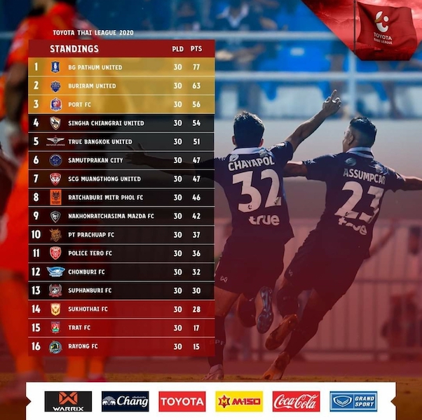 Two quick goals from Maicon (27th and 30th minute) were enough for Buriram to complete the season with 63 points as Port FC had to be content with the third spot with 56 points.