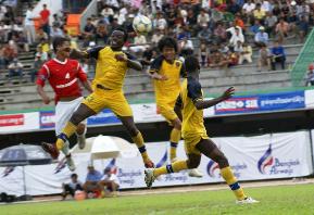 Ek Vannak’s early strike in the 23rd minute for Moha Garuda set the rhythm for the game but Naga Corp were quick to respond in the 38th minute off Ndjana Pierre for both teams to be on level terms at the break. But the restart saw a determined Moha Garuda to take the lead and they took only four minutes to go in front from A. Sila Sunday before A. Kenneth fought back for Naga in the 71st minute for the score to be at 2-2. However, four minutes to the end Loch Sophia slammed home the winner for Moha Garuda as they stayed off the bottom of the table with ten points from seven matches. In the meantime, there really was no contest in the match between Phuchung Neak FC and Phnom Penh Empire which saw the latter coasting to an easy 4-0 victory. Phnom Penh’s goals were scored by Keo So Ngan (11th minute), Chim Ratanak (42nd minute) and Chan Rithy (81st and 88th minute). With the win, Phnom Penh are now on third behind Build Bright United FC and Khemara Keila FC. CURRENT CAMBODIA PREMIER LEAGUE 2008 STANDINGS 1. BUILD BRIGHT UNITED FC 16pts (+10) 2. KHEMARA KEILA FC 12pts (+4) 3. PHNOM PENH EMPIRE FC 15pts (+9) 4. PREAH KHAN REACH FC 10pts (+1) 5. NAGA CORP FC 9pts (=) 6. PHUCHUNG NEAK FC 8pts (-5) 7. KIRIVONG SOK SEN CHEY FC 8pts (-4) 8. NATIONAL DEFENSE MINISTRY FC 10pts (+2) 9. MOHA GARUDA FC 10pts (-2) 10. INTRY KRAHAM-POST FC 3pts (-15) PIC: Moha Garuda (in red kit) vs Naga Corp FC (in yellow) |