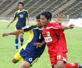 Khemara Keila FC, buoyed by their recent win of the Hun Sen Cup crown, did not seem to flinch even though they fell behind as early as the fourth minute to Lam Thanh Giang strike for Kirivong Sok Sen Chey FC. But Khemara bid their time well and they were quick to grab the equalizer in the 33rd minute off Sok Phal Odom for both teams to be on par at the break. A goal at the hour mark from Ty Bun Vichitr and then another from Sok Phal (73rd minute) made sure that Khemara win their first three points of the season. For Moha Garuda, they just failed to find the momentum after conceding the first goal to Intry Kraham-Post FC when San Sovannak slammed home a 23rd minute lead. And even though Intry did manage to nail the equalizer off Joshep three minutes later, there was no stopping Sovannak from grabbing his second goal and that off Intry five minutes after the restart. Em Sovannarith then wrapped up the full points for Intry with the third goal on 65th minute. PIC: INTRY KRAHAM-POST FC (in blue) vs MOHA GARUDA FC (in red) |