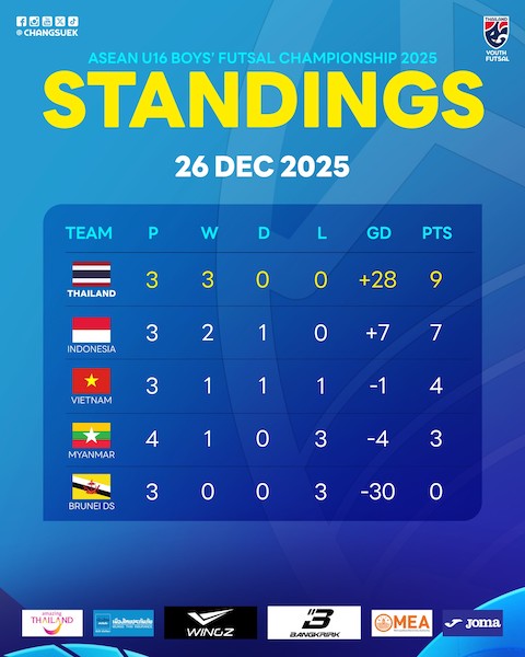 BANGKOK (26 December 2025) – Thailand beat Vietnam 5-1 to stay top of the standings in the ASEAN Under-16 Boys’ Futsal Championship 2025 here at the Nonthaburi Hall in Bangkok.
