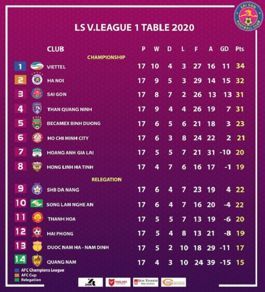 After 17 matches – four in the Championship Round so far – Viettel have picked up 34 points against Hanoi’s 32.